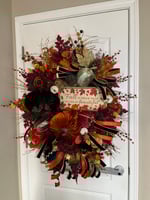 Beautiful fall wreath with gorgeous velvet pumpkins, designer ribbon, sunflowers, and fall floral sprays that give it the perfect look to draw attention to your door.
