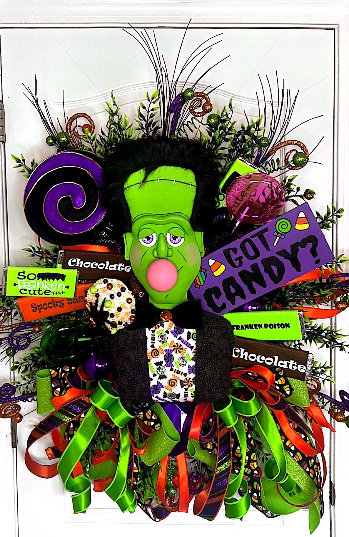 Sweeten up your spooky season with Mr. Frankenstein. This wreath is full of vibrant colors and wonderful treats.